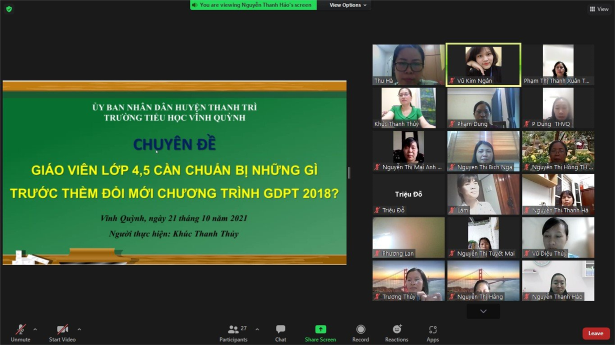 Chương trình giáo dục phổ thông mới được Bộ GD&ĐT ban hành từ năm 2018. Năm học 2020-2021 đã áp dụng chương trình mới cho tất cả học sinh lớp 1. Năm học 2021-2022 này đã áp dụng cho lớp 2, lớp 6 và đến năm 2024-2025, tất cả các lớp học sẽ triển khai chương trình giáo dục phổ thông mới. Để chương trình thành công, đòi hỏi sự nỗ lực lớn từ bộ, ngành, sở và nhân tố góp phần quyết định lớn chính là đội ngũ giáo viên. Nhận rõ vấn đề này, ngày 21/10/2021, trường Tiểu học Vĩnh Quỳnh tổ chức chuyên đề online bồi dưỡng giáo viên chương trình GDPT 2018: “Giáo viên lớp 4, 5 cần chuẩn bị những gì trước thềm đổi mới chương trình GDPT 2018?” do cô Khúc Thanh Thủy – Phó Hiệu trưởng thực hiện.