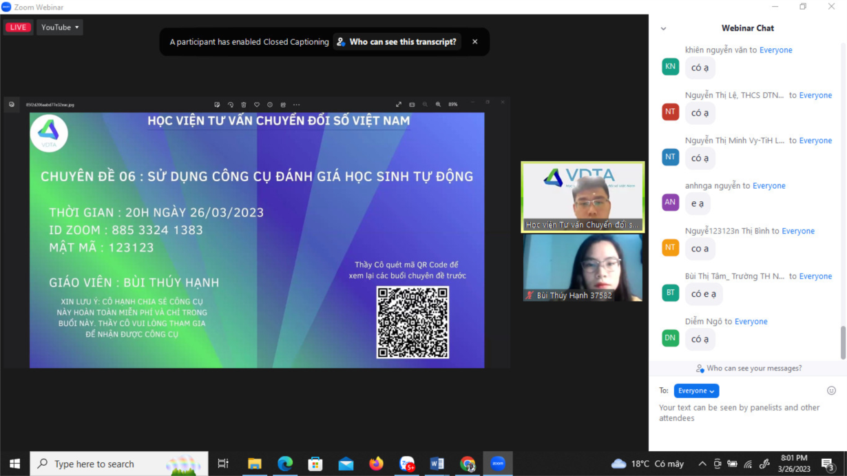 Tối ngày 26/3/2023, cô giáo Bùi Thúy Hạnh (GV khối 4, trường Tiểu học Vĩnh Quỳnh) đã kết hợp với VDTA - Học viện Tư vấn Chuyển đổi số Việt Nam chia sẻ miễn phí tới tất cả các thầy cô là giáo viên tiểu học về công cụ đánh giá HS tự động dành cho giáo viên Tiểu học trên CSDL ngành GD&ĐT.