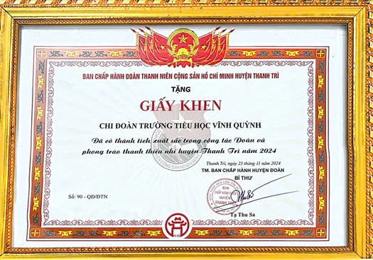 Trong năm 2024, Chi đoàn trường Tiểu học Vĩnh Quỳnh đã có nhiều hoạt động ý nghĩa, sôi nổi và tham gia tích cực các hoạt động, nhiệm vụ Huyện đoàn phát động, tổ chức. Chi đoàn đã được Huyện đoàn tặng giấy khen cho tập thể có thành tích xuất sắc trong công tác Đoàn và phong trào thanh thiếu nhi năm 2024.