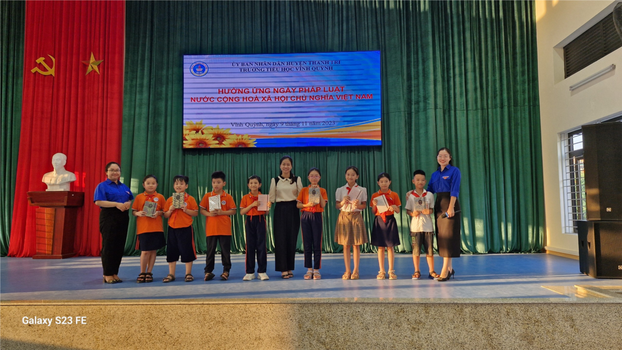Thực hiện Công văn số 3586/SGDĐT –VP của Sở GDDT Hà Nội về việc tổ chức hưởng ứng “Ngày pháp luật nước Cộng hòa xã hội chủ nghĩa Việt Nam”, Chi đoàn phối hợp với Liên đội trường Tiểu học Vĩnh Quỳnh đã triển khai nhiều hoạt động ý nghĩa nhằm tuyên truyền, phổ biến pháp luật tới học sinh toàn trường vào chiều ngày 9/11/2023.