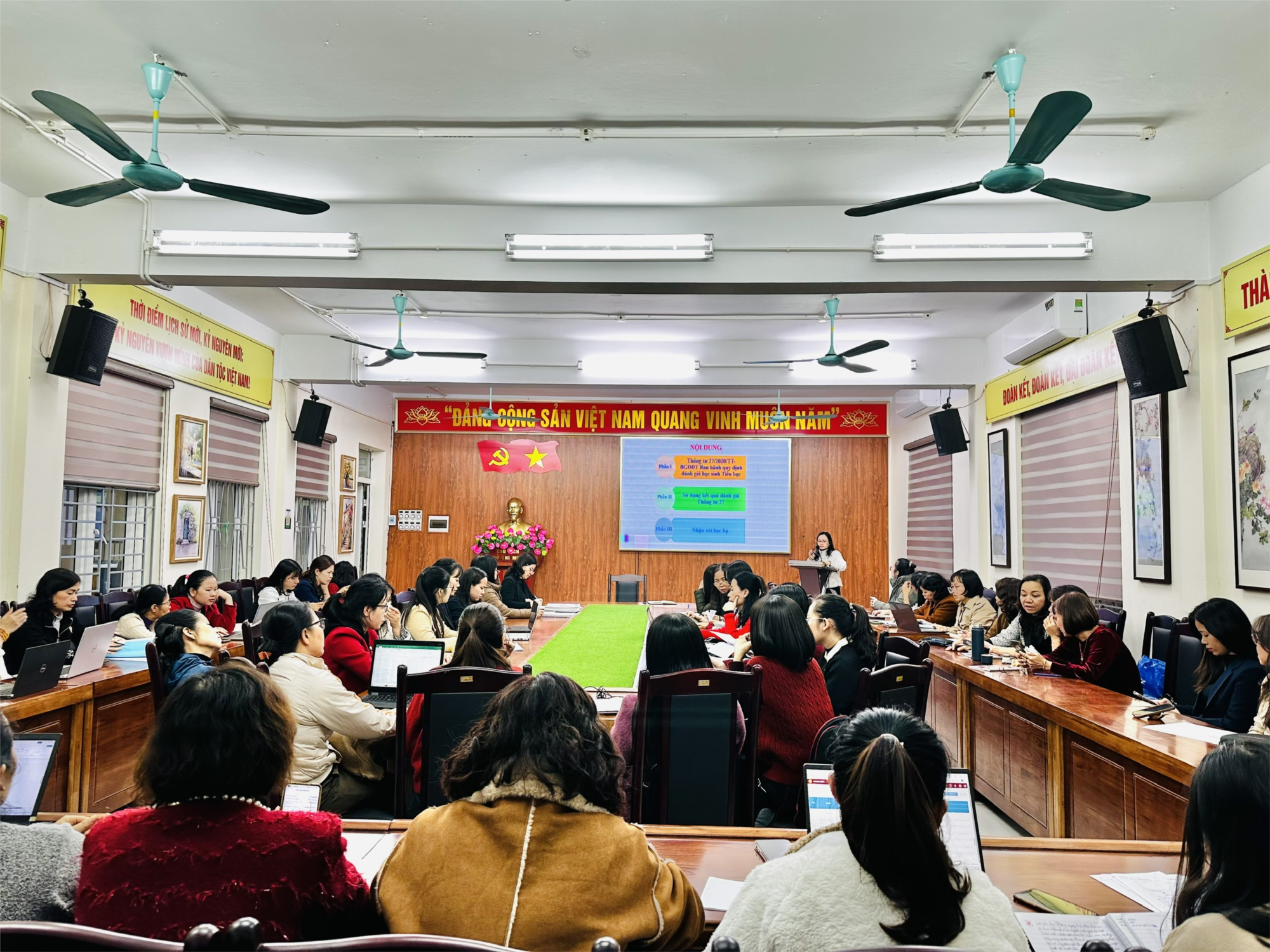 Buổi tập huấn được thực hiện bởi 2 đồng chí Phạm Thị Thanh Xuân và Khúc Thanh Thuỷ – Phó hiệu trưởng nhà trường cùng sự có mặt của đông đủ các đồng chí giáo viên trong hội đồng sư phạm.